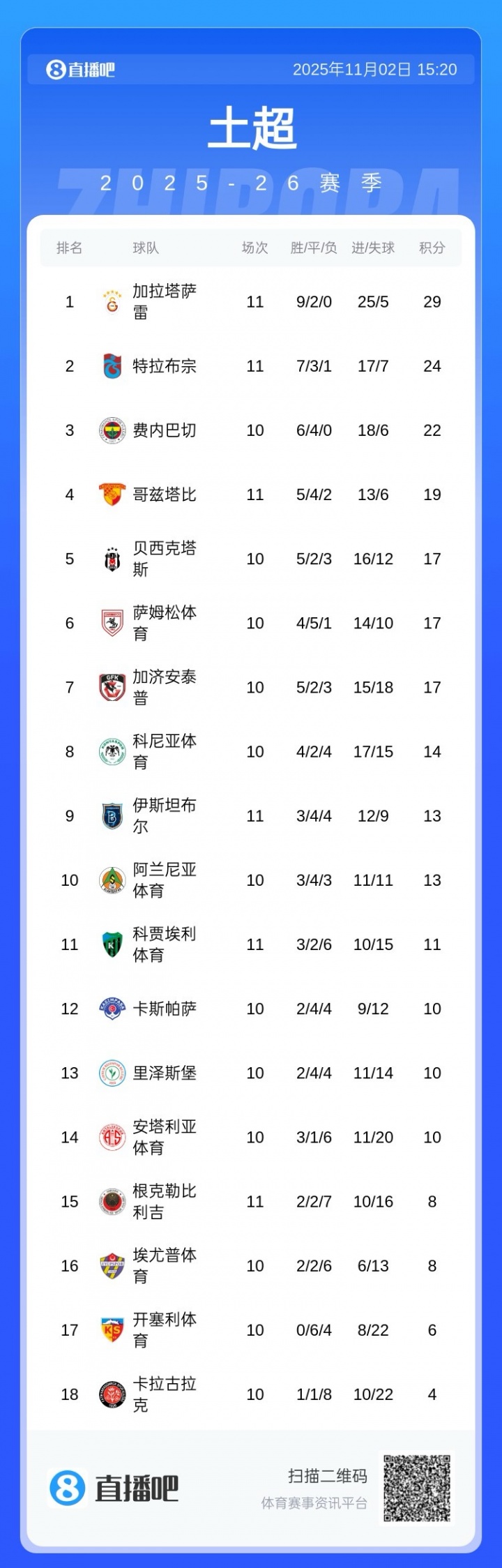 11月02日讯 土超第11轮一场比赛,加拉塔萨雷0-0特拉布宗。