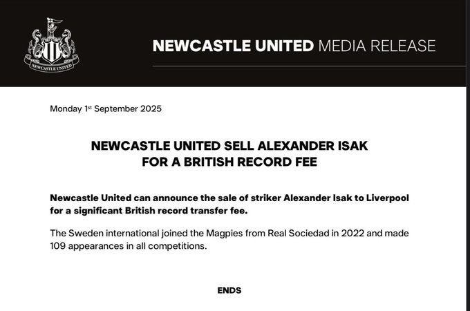 纽卡伊萨克公告仅37字,记者:这充分阐扬了球队如何看待他的行径