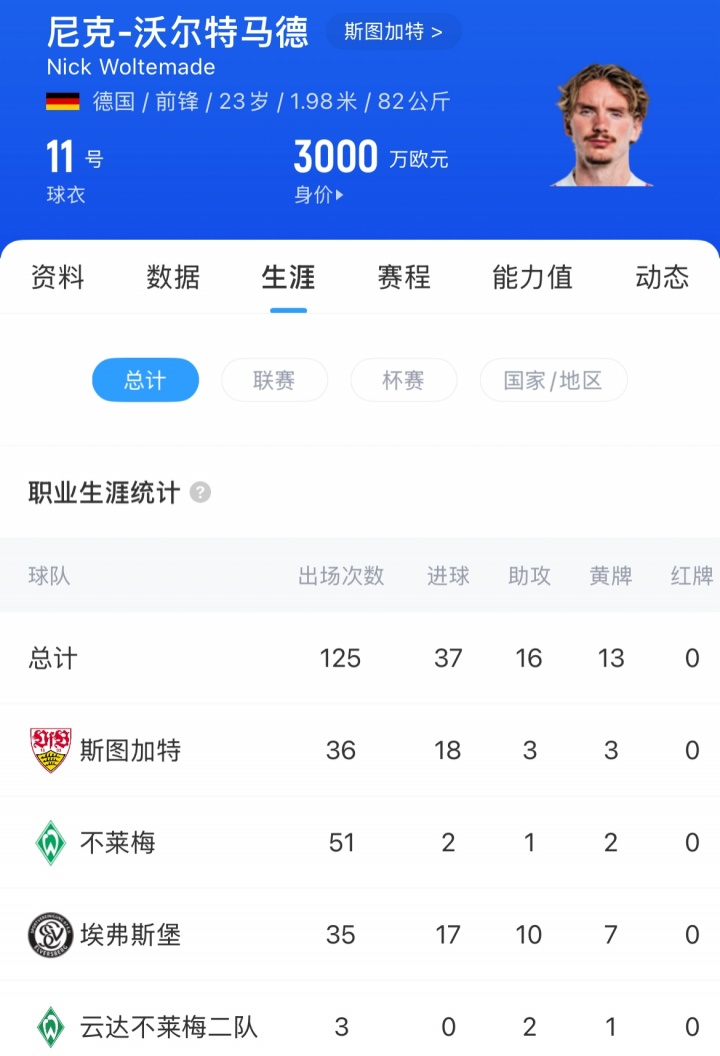 沃尔特马德上赛季共为斯图加了得战33场,打进17球助攻3次,当今德回身价3000万欧。