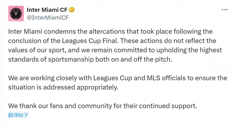 咱们正在与定约杯、好意思国管事足球大定约官员缜密融合,确保妥善处治此事。感谢咱们的球迷和社区一直以来的复旧。”
