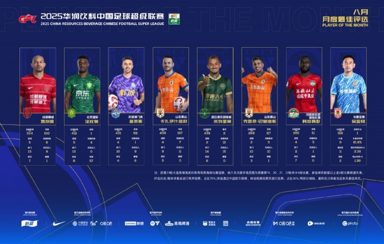 注:因第23轮大连英博海发对阵青岛西海岸比赛脱期,故八月月度评比领域为联赛第19、20、21、22轮总共4轮比赛,参选球员数据以上述4轮比赛数据为准。