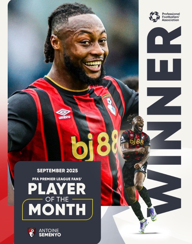 10月13日讯 PFA(英格兰工作球职工会,Professional Footballers' Association)官方晓示,伯恩茅斯边锋塞梅尼奥当选球迷票选英超9月最好球员。