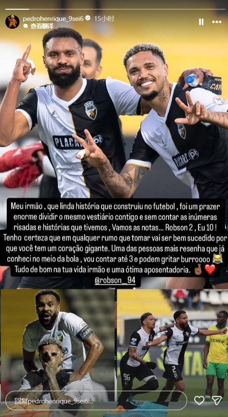 10月21日讯 在大连英博为罗伯森举办退役典礼后,曾与罗伯森共同在法伦斯竞技的云南玉昆外助佩德罗-恩里克,通过社媒向罗伯森奉上了祝愿。