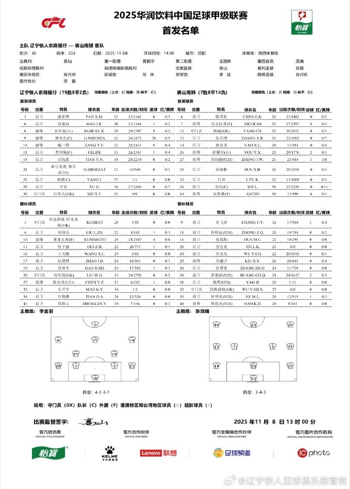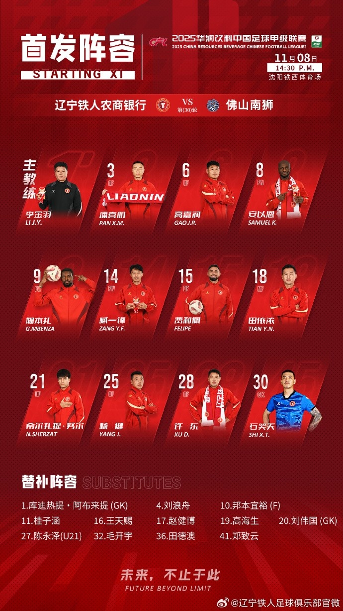 中甲第30轮,辽宁铁东谈主vs佛山南狮首发出炉