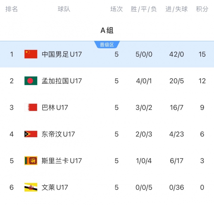 11月30日讯 当天U17亚初赛临了一轮,U16国足征服孟加拉国,5轮全胜领跑积分榜,凯旋晋级来岁U17亚洲杯。最终积分榜如图。