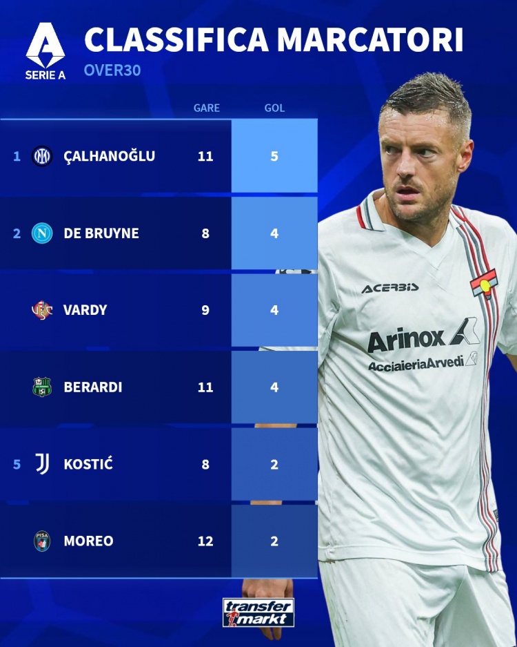 意甲年纪30+球员弓手榜:恰尔汗奥卢5球居首,丁丁、瓦尔迪4球