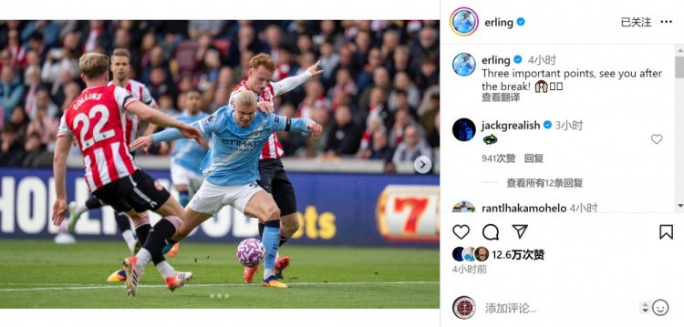 哈兰德社媒晒出比赛像片庆祝到手,配文:“蹙迫的三分,我们休赛期之后见!”
