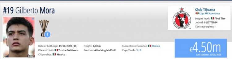 吉尔伯托-莫拉司职中场,刻下效用墨西哥联赛的蒂华纳,本赛季出战8场比赛孝敬3球1助的数据,身价450万欧。