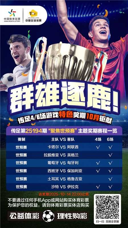 第25194期传足4/6场游戏特质奖期依然于2025年10月12日20:00开售,将于2025年10月14日22:00停售,并于10月15日开奖,其中卡塔尔VS阿联酋、葡萄牙VS匈牙利、西班牙VS保加利亚和沙特VS伊拉克为4场进球游戏竞猜赛事。