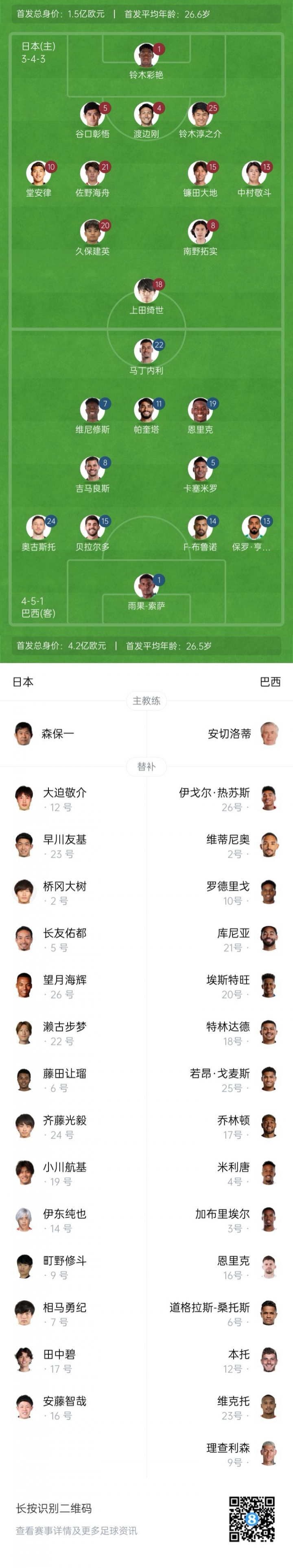 本月国外比赛日,日本此前2-2战平巴拉圭,巴西则是5-0狂胜韩国。