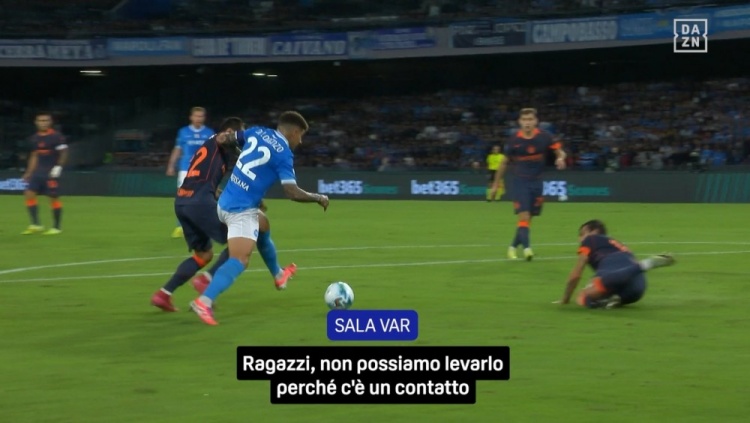 VAR: "确乎,迪洛伦佐有介入,但他介入是因为一个四肢……他并不是为了争取不属于球的空间而伸腿,而是为了保护球而伸腿。咱们来看一下姆希塔良的四肢,稍等。望望迪洛伦佐的脸,他正保护着球。稍等一下,我在核实。”
