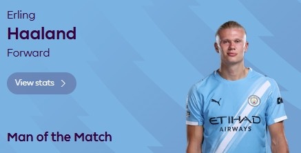 双响!英超官方:哈兰德当选曼城3-1伯恩茅斯一役全场最好球员