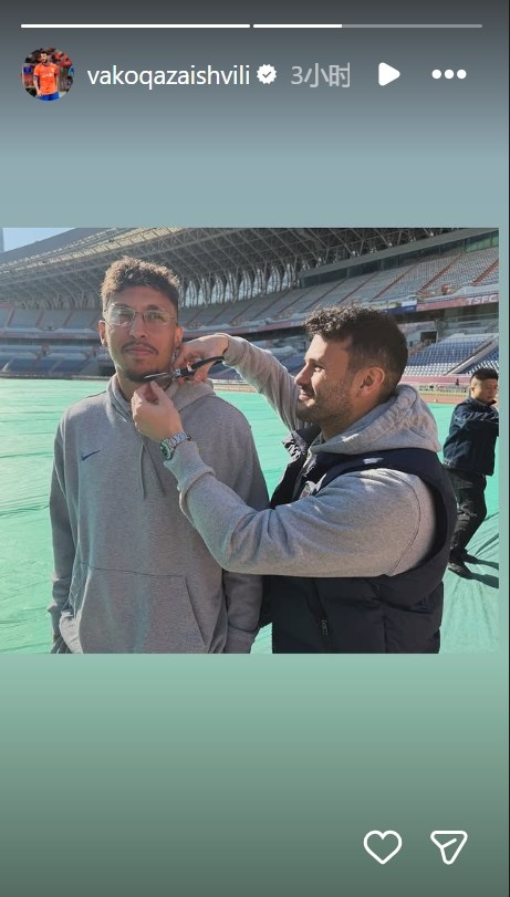 11月19日讯 泰山球员瓦科·卡扎伊什维利更新社媒,晒出他为克雷桑剪胡子的相片。
