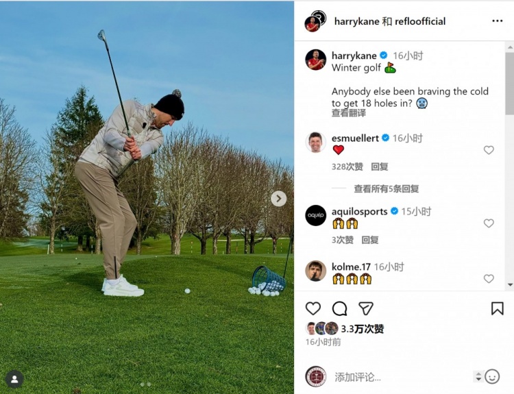 穆勒点赞!凯恩晒打高尔夫像片:还有谁顶着寒风打完18洞🥶