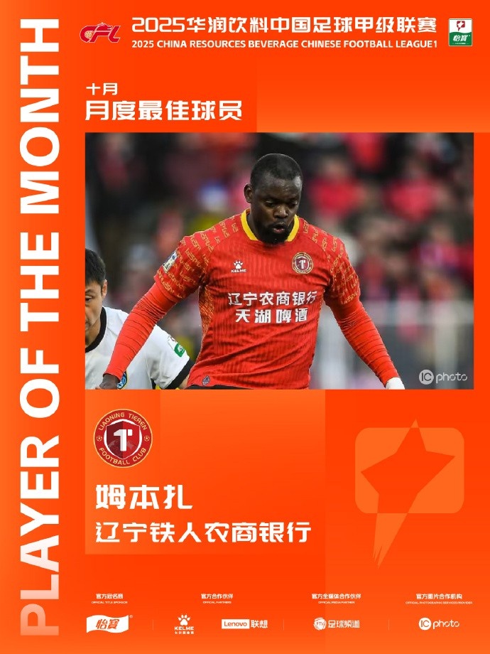 官方:4场6球,辽宁铁东说念主外助姆本扎当选中甲10月最好球员