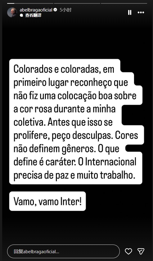 在采访的后半段,阿贝尔评释,这句话是一句打妙语。但该言论依旧被视为恐同言论,阿贝尔·布拉加随后也在个东谈主社媒INS上谈歉。