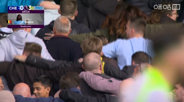 嗨起来!曼城3-0领跑 蓝军,看台曼城球迷们肩并肩开始跳!