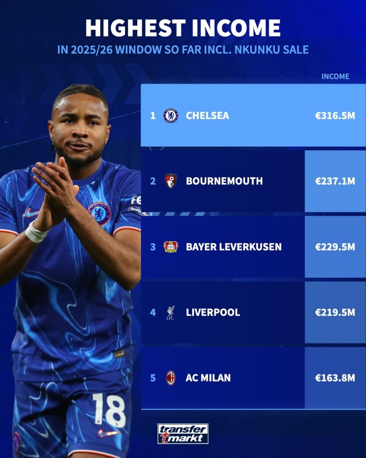08月28日讯 据多家媒体音尘,恩昆库行将以逾越4000万欧元转会费加盟米兰,据德转统计,切尔西今夏卖东谈主总收入将达到3.165亿欧元,冠绝全欧,比卖东谈主榜第二位的伯恩茅斯多了近8000万欧元。
