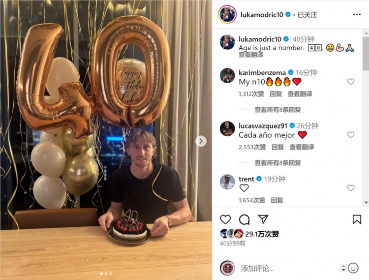 莫德里奇迎来40岁寿辰,他在外交媒体上晒出身日蛋糕,配文:“年事仅仅一个数字,40岁😬💪🏻🙏🏻”