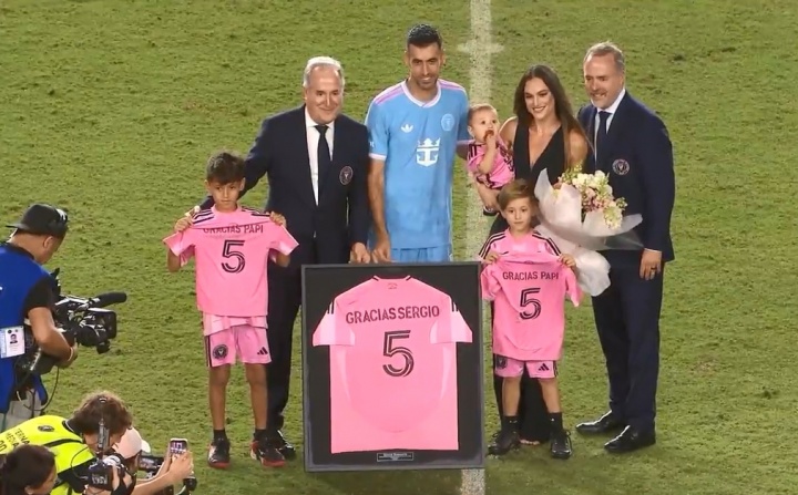 好意思职联迈阿密4-1新英格兰改进赛后,布斯克茨带着老婆和三个孩子投入退役典礼。
