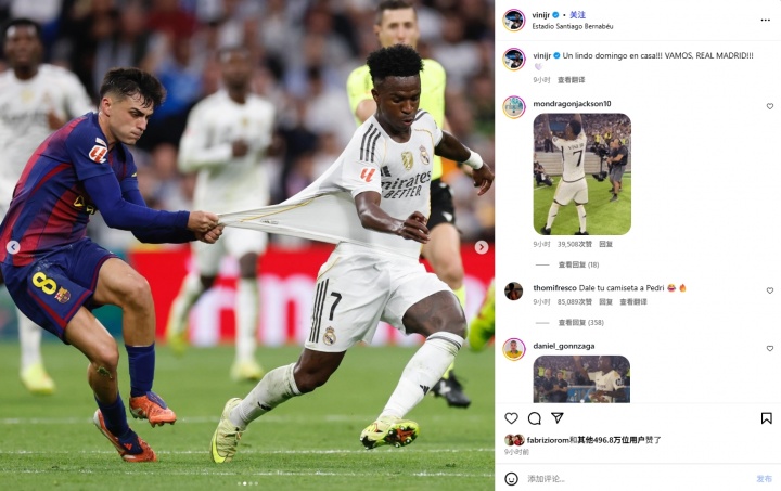 国度德比名步地🖼️维尼修斯社媒晒图,佩德里铆足劲儿拉他球衣