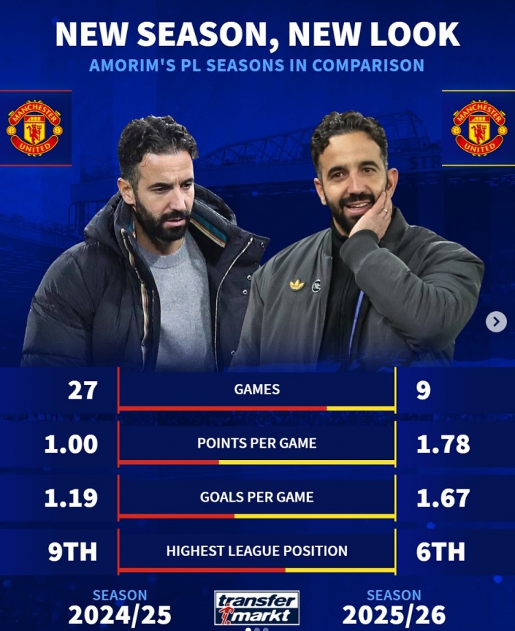 进步!阿莫林本赛季英超场均1.78分+1.67球,上赛季仅1分+1.19球