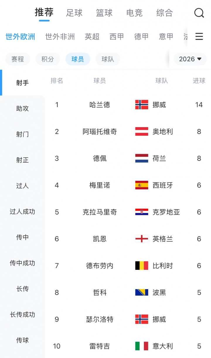 世初赛欧洲区当今的弓手榜,哈兰德14球断层领跑。他也基本治服拿下金靴。