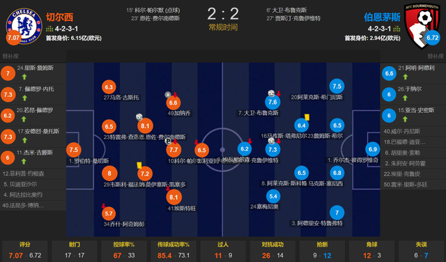 最终,切尔西主场2-2战平伯恩茅斯,蓝军近7轮仅1胜,从争冠到争五;伯恩茅斯更是10轮不堪,确切英超的难兄难弟。