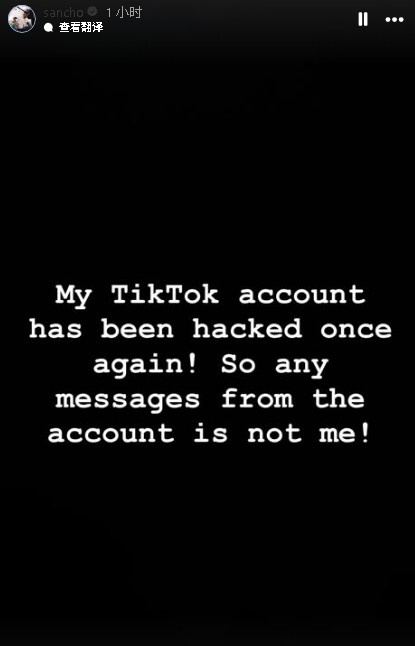 被黑了!桑乔:我的TikTok账号再次被盗!任何发出的音书皆非本东谈主