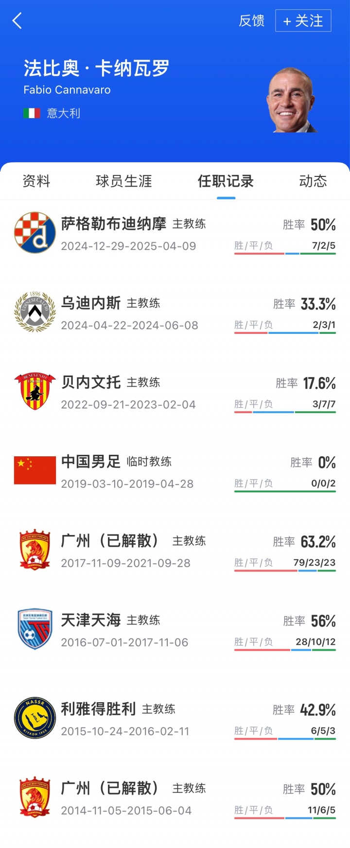 卡纳瓦罗现年52岁,曾持教广州恒大、利雅得告捷、天津权健、贝内文托、乌迪内斯和萨格勒布迪纳摩。2019年3月-4月,卡纳瓦罗曾出任国足临时主帅,带队缔造中国杯,2场比赛均以0-1的比分不敌乌兹别克斯坦和泰国队。