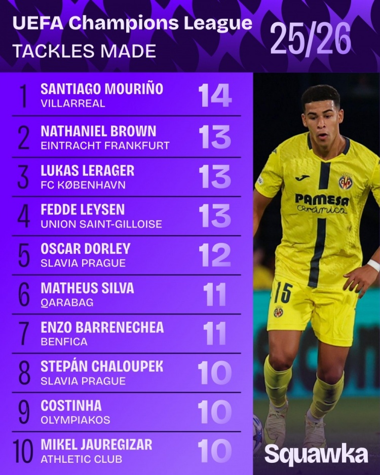 10月23日讯 本赛季欧冠联赛阶段已战罢3轮,Squawka统计了到当今畛域的铲球榜单,比利亚雷亚此后卫圣地亚哥-穆里尼奥14轮换一,法兰克福后卫布朗等三东说念主13次分列二至四位。