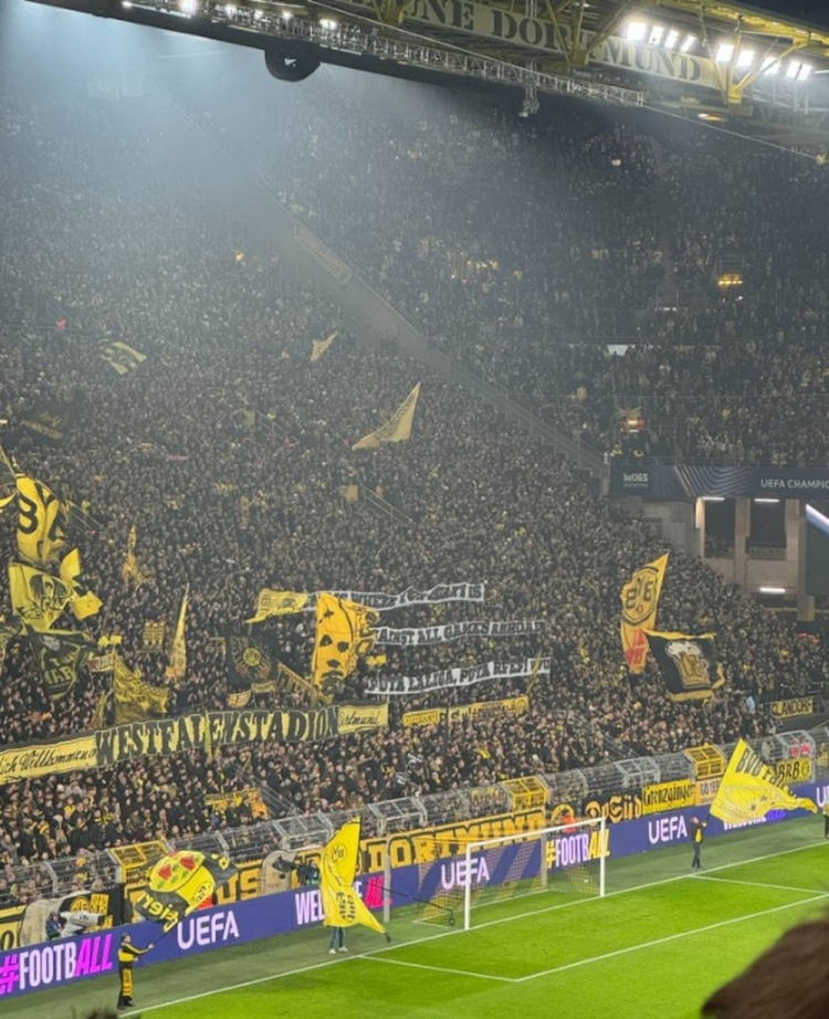 11月26日讯 今天凌晨,多特在欧冠大捷比利亚雷亚尔,多特球迷在比赛中拉起横幅,与比利亚雷亚尔球迷一同反对西甲国际赛。