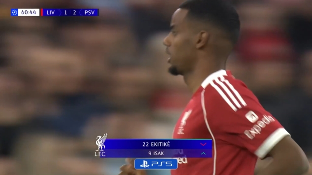 11月27日讯 欧冠联赛阶段第5轮利物浦vs埃因霍温,第61分钟,埃基蒂克因受伤无法坚抓比赛,利物浦替换上伊萨克。
